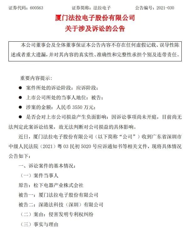 《日本经济新闻》11月15日报导,日本松下电器产业株式会社因认定厦门法拉电子生产的薄膜电容器涉及侵权,日前已向中国广东省深圳市中级人民法院提告,要求法拉电子停止该产品的制造和销售,并求偿人民币 3500 万元。
