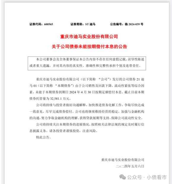 5月6日,迪马股份(600565.SH)公告称,公司债券“21迪马01”由于公司销售及回款下降,流动性紧张等综合因素,未能于本期债券到期日2024年4月30日按期足额偿付本息。