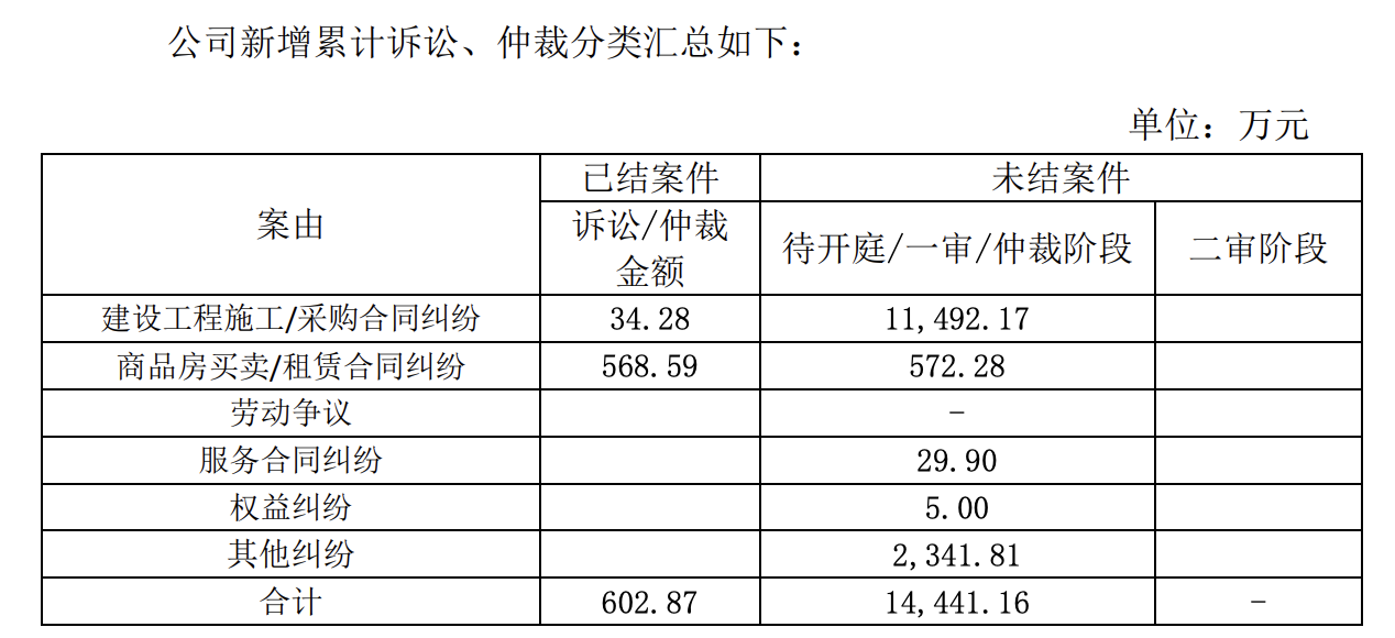 其中,累计未结诉讼、仲裁案件金额合计1.44亿元,累计已结诉讼、仲裁案件金额为602.87万元;累计主动诉讼、仲裁金额合计为176万元,累计被动诉讼、仲裁金额合计为1.49亿元。