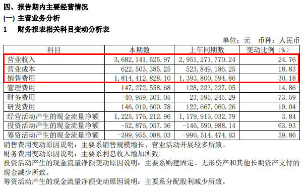 具体来看,2012年营收19.2亿元、销售费用10.6亿元,到 2019年营收增至69.40亿元,销售费用也增至34.49亿元;2021年上半年营收36.8亿元,这半年的销售费用已高达18.14亿元。
