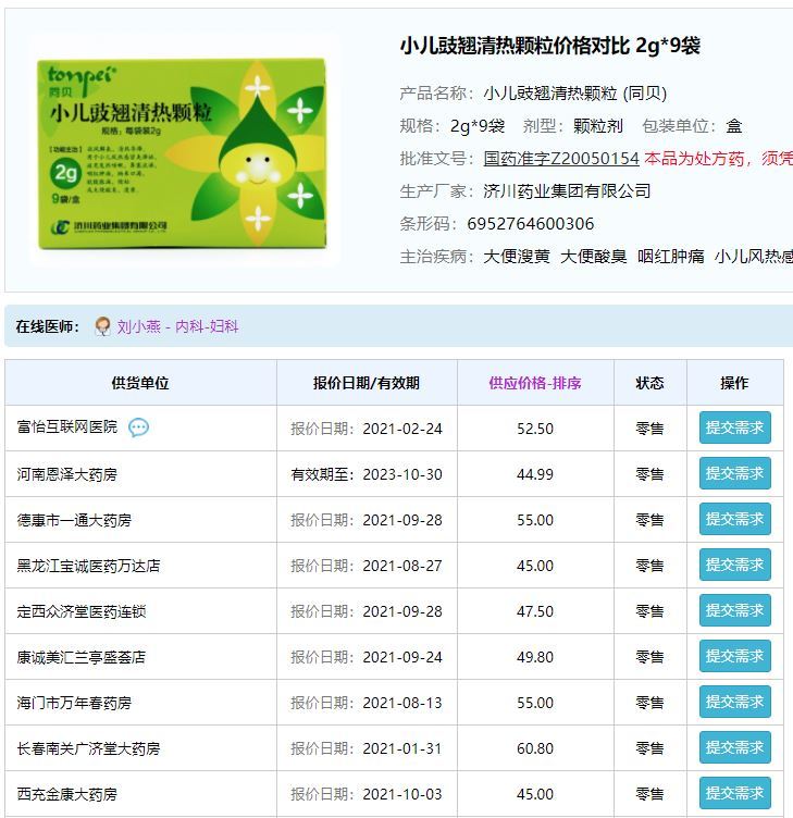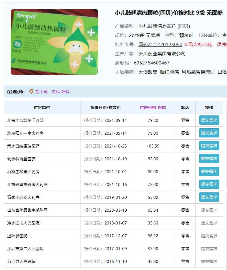 图片来源:小儿豉翘清热颗粒的医院处方售价