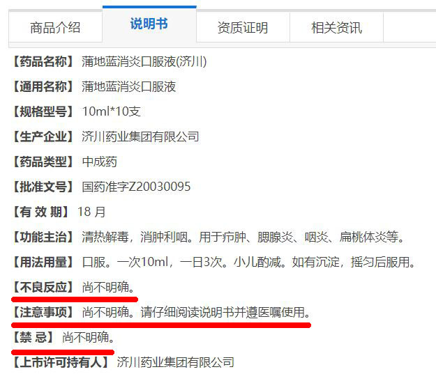 济川药业蒲地蓝消炎口服液被多个省份移出当地医保目录,是否与其安全性及临床滥用有关,不得而知。但凤凰健康从“健客网上药店”查询发现,其在售济川药业蒲地蓝消炎口服液的说明书中,“不良反应”“禁忌”“注意事项”均显示“尚不明确”。国家规定已出台两年,济川药业何以无动于衷?
