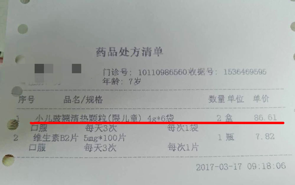 早在2017年,一位妈妈便在网上吐槽小儿豉翘清热颗粒的售价。其时,他的儿子喉咙肿痛,到医院就医开了维生素B和4g*6袋/盒规格小儿豉翘清热颗粒,后者售价高达86.61元/盒。但同期零售药店售价不到40元。