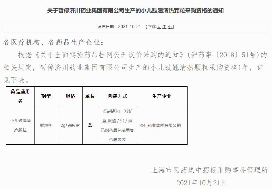 但就在蒲地蓝消炎口服液的负面消息尚未消化殆尽之际,上海市医药集中招标采购事务管理所便在10月21日发布通告,暂停济川药业的2g*9袋/盒规格小儿豉翘清热颗粒。