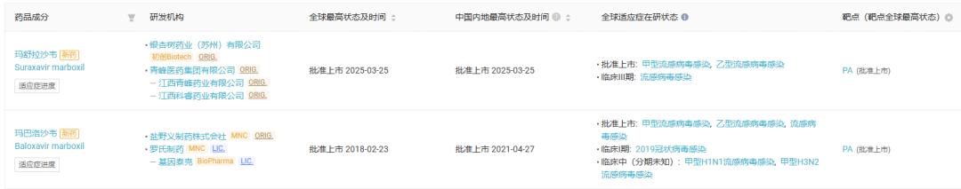 Insight 数据库显示,此前国内已获批 2 款 PA 靶点抑制剂,分别是盐野义制药的玛巴洛沙韦和银杏树药业/青峰医药的玛舒拉沙韦。如今玛硒洛沙韦获批,成为国内第 3 款、国产第 2 款 PA 靶点抑制剂。