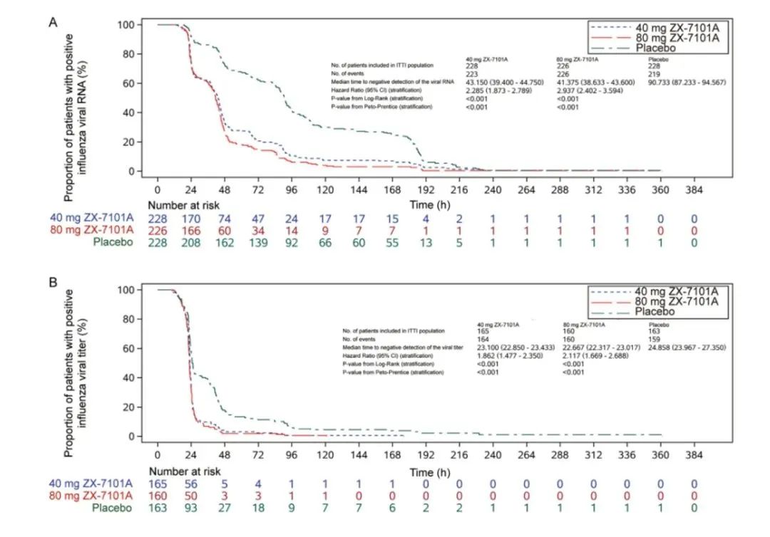在病毒学指标上,玛硒洛沙韦 40 mg 组、80 mg 组的流感病毒 RNA 转阴时间分别为 43.2 h 和 41.4 h,显著短于安慰剂组的 90.78 h。与安慰剂组相比,玛硒洛沙韦组病毒滴度中位检测时间显著缩短,且在治疗后 24 h、48 h 和 96 h,能检测到流感病毒 RNA 或病毒滴度的患者比例,也显著低于安慰剂组。