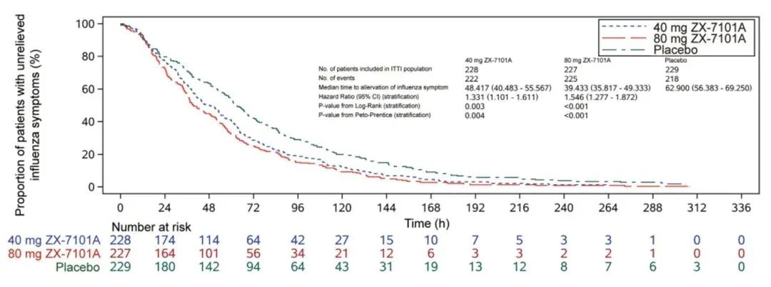 该研究的具体结果发表在感染病领域顶刊《Clinical microbiology and infection》。数据显示,与安慰剂组相比,玛硒洛沙韦组流感症状缓解时间显著缩短,玛硒洛沙韦 40 mg、80 mg 组及安慰剂组流感症状中位缓解时间分别为 48.4 h、39.4 h 和 62.9 h,且在体重 80kg 和 80kg 亚组患者中,症状缓解时间无明显差异,无需根据体重调整剂量。