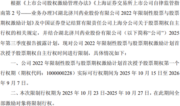 每当上市公司传出股权激励的可行权消息,往往新激励对象正加速奔向财务自由的幸福彼岸。今年10月15日,因满足约定行权条件,济川药业(股票代码:600566)官宣将启动2022年股权激励计划中首次授予股票期权的行权窗口。
