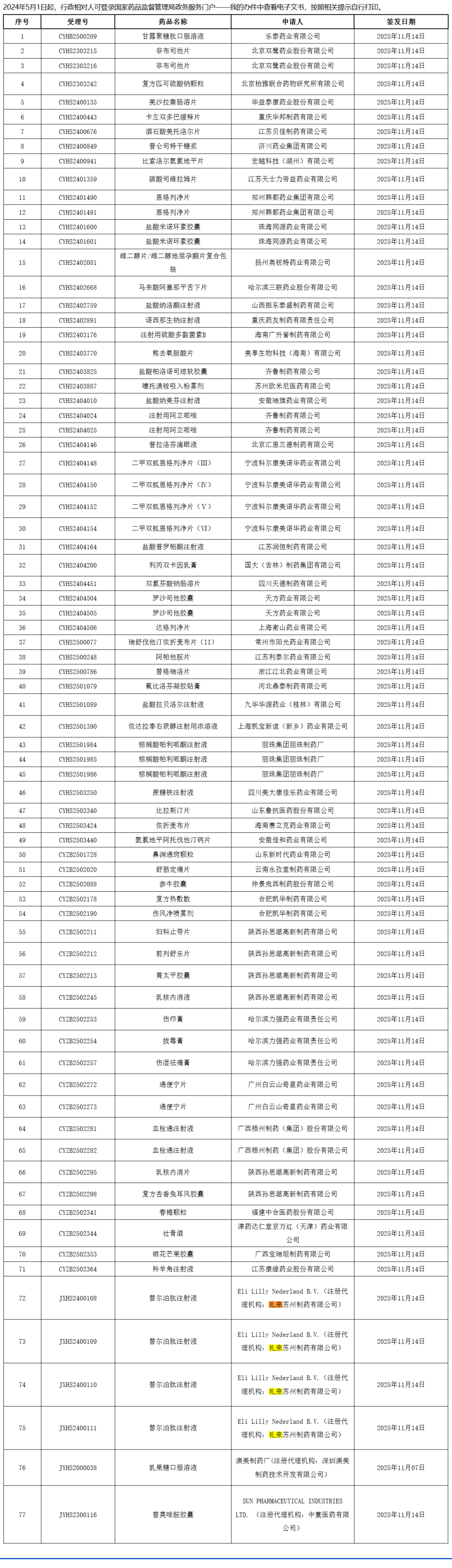 11月17日,NMPA官网发布了最新一批通知件,此次共涉及77个受理号(65款品种),数量颇为可观,其中不乏多款重磅品种。