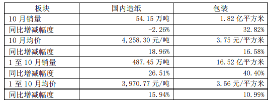 山鹰国际表示,去年同期国内疫情逐步控制,下游需求超额释放导致销量较高,受此影响,10月国内造纸销量同比有所下滑;国内造纸销量和价格环比分别上涨 7.86%和 6.40%,国内包装销量和价格环比分别上涨1.99%和0.90%;2021 年公司产能规模扩大,产品市场占有率提升,国内造纸、包装板块累计销量持续增长。