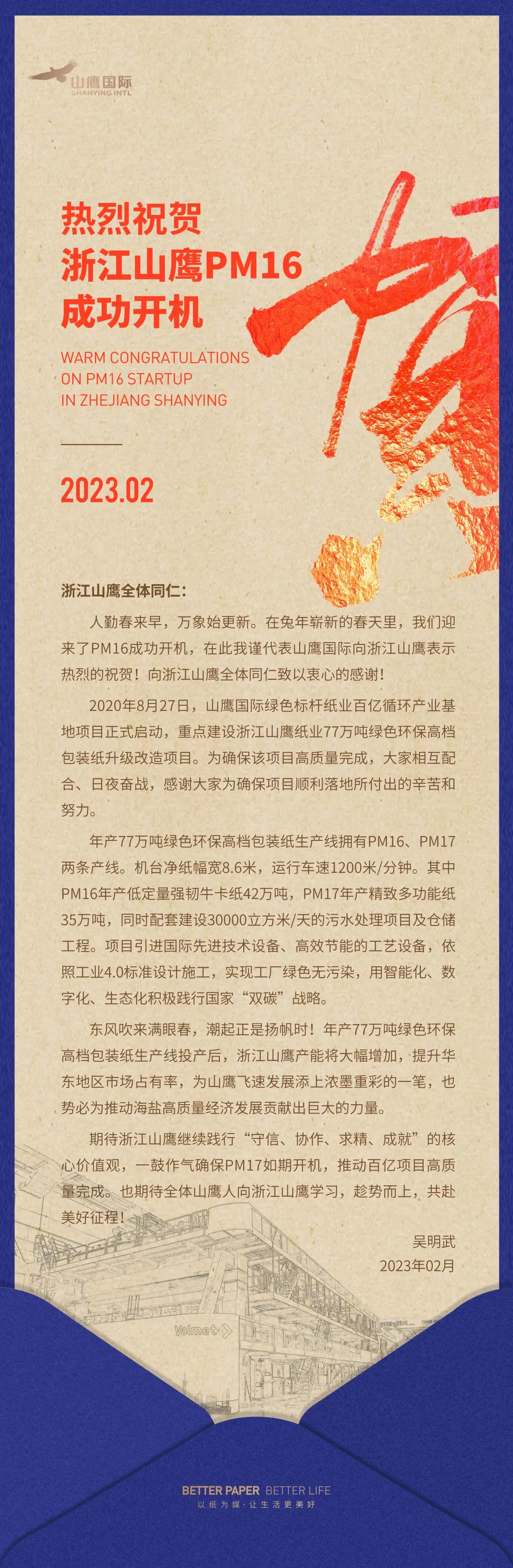 山鹰国际控股股份公司董事长吴明武先生代表山鹰国际对PM16的顺利开机投产致以最热烈的祝贺,并发表热情洋溢的贺信。