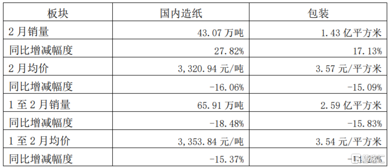 山鹰国际(600567.SH)公布2023年2月经营数据快报,国内造纸销量43.07万吨,同比增长27.82%;包装销量1.43亿平方米,同比增长17.13%。如下: