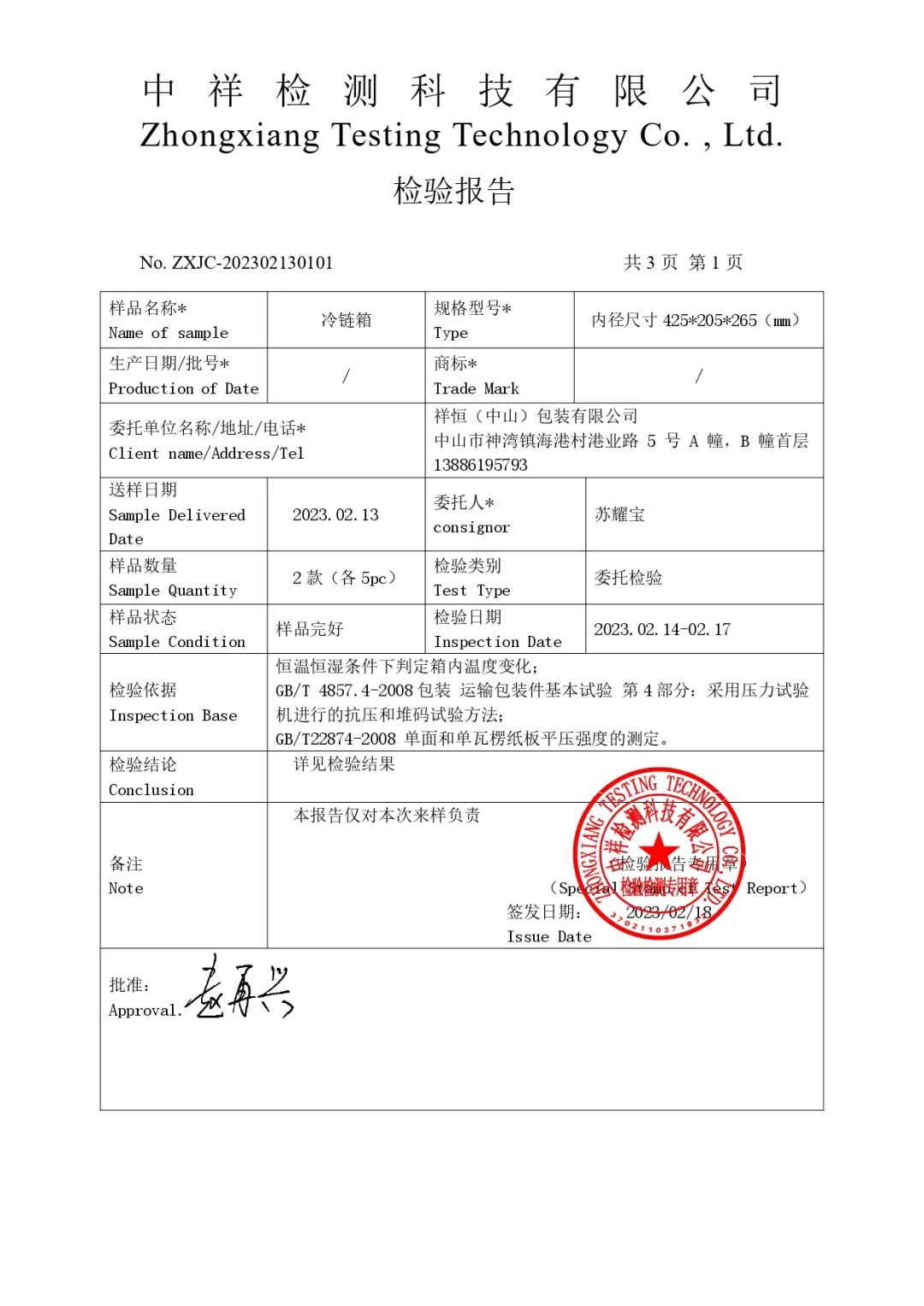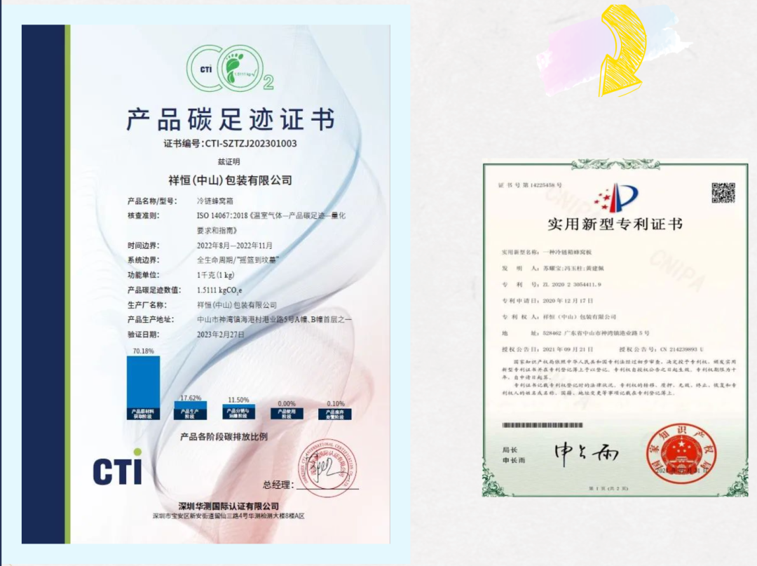 目前,中山祥恒的冷链蜂窝箱已取得了实用新型专利证书(证书号:第14225458号),并获颁产品碳足迹证书(证书编号:CTI-SZTZJ202301003)。