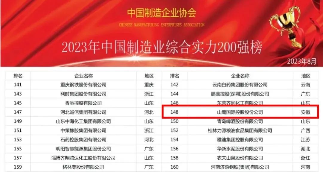 此外,经中国制造企业协会调研评选,2023年中国制造业综合实力200强暨中国装备制造业100强排行榜发布。山鹰国际入选中国制造业综合实力200强榜单,位居第148名。