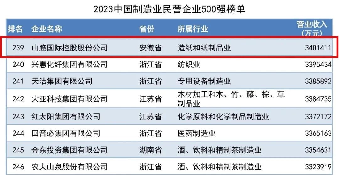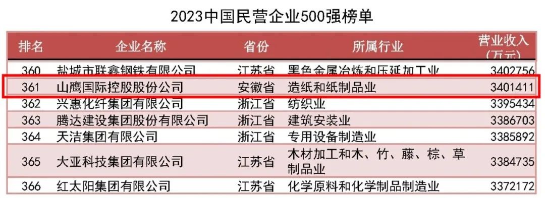 日前,全国工商联在山东济南发布了“2023中国民营企业500强”榜单和“2023中国制造业民营企业500强”榜单,山鹰国际控股股份公司以340.14亿元的营收荣登两个排行榜,分别位列榜单第361位、第239位。
