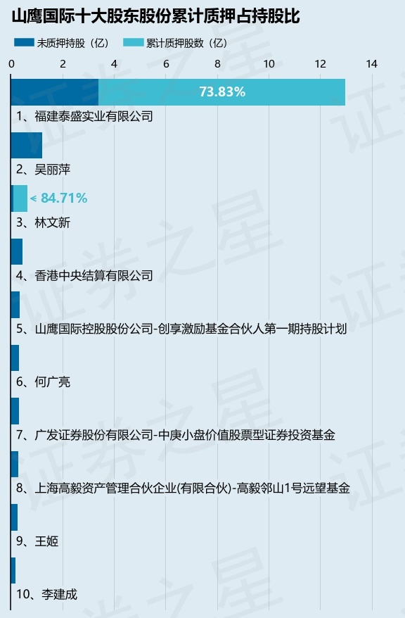 截止本公告日,股东福建泰盛实业有限公司已累计质押股份9.58亿股,占其持股总数的73.83%,股东林文新已累计质押股份5439.9万股,占其持股总数的84.71%。本次质押后山鹰国际十大股东的累计质押股份占持股比例见下图: