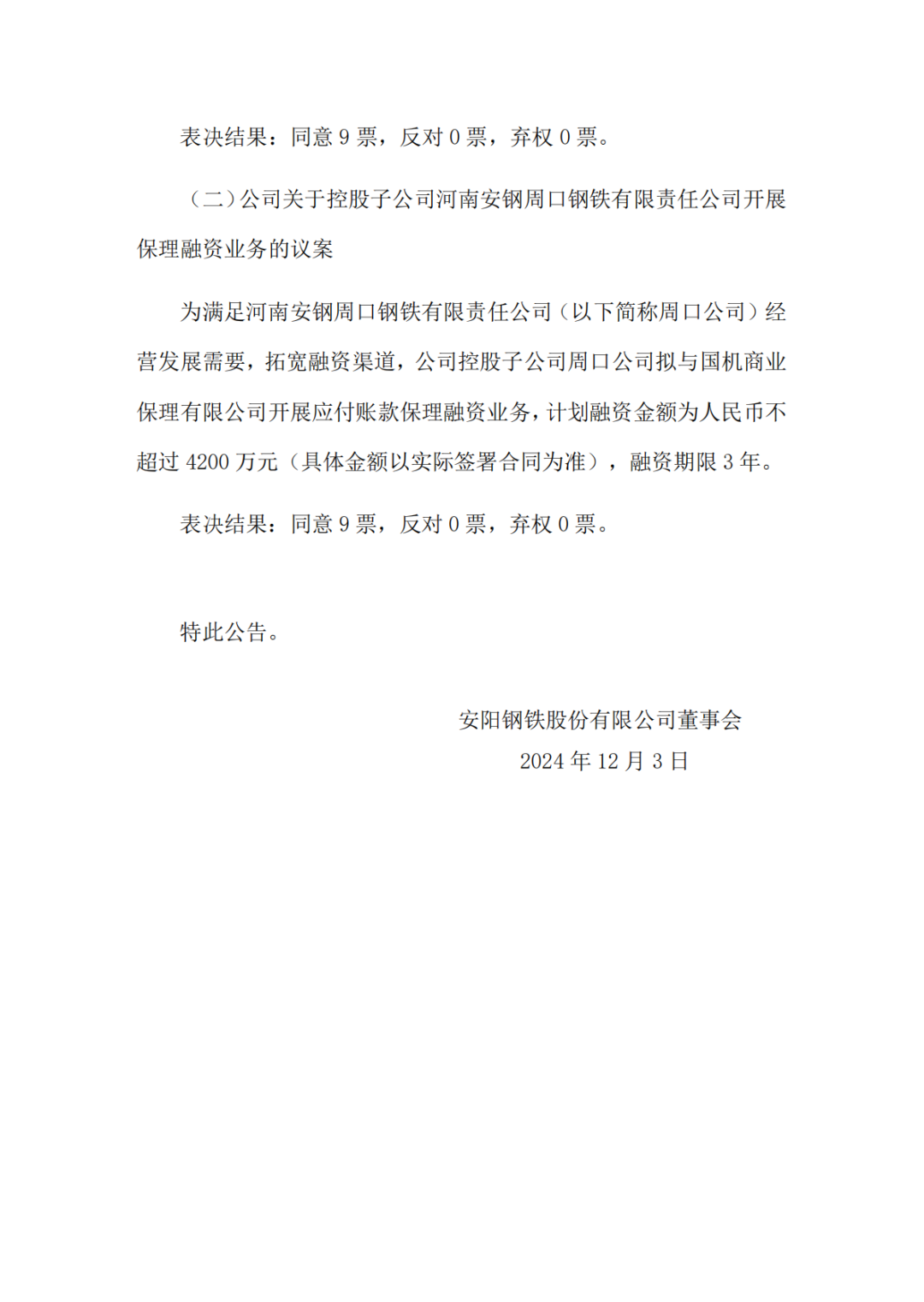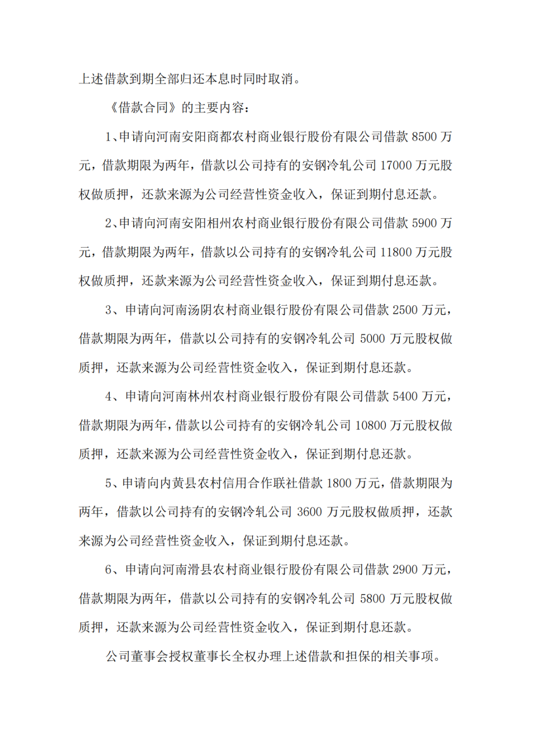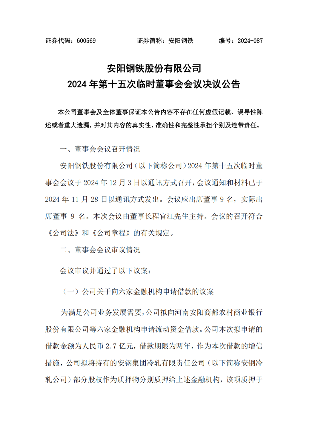 安阳钢铁股份有限公司2024年第十五次临时董事会会议于2024年12月3日以通讯方式召开。会议审议并通过了“公司关于向六家金融机构申请借款的议案”,议案表示:为满足公司业务发展需要,公司拟向河南安阳商都农村商业银行股份有限公司等六家金融机构申请流动资金借款。公司本次拟申请的借款金额为人民币2.7亿元,借款期限为两年,作为本次借款的增信措施,公司拟将持有的安钢集团冷轧有限责任公司部分股权作为质押物分别质押给上述金融机构,该项质押于上述借款到期全部归还本息时同时取消。