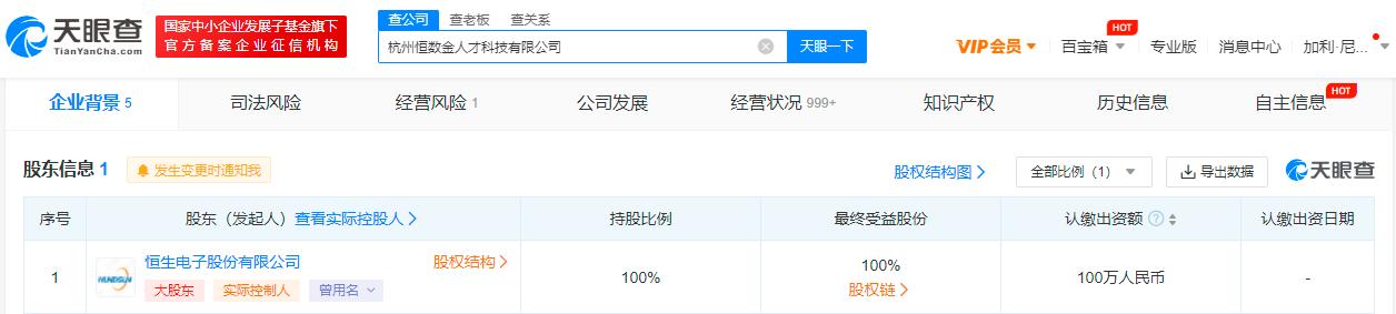 5月30日,杭州恒数金人才科技有限公司成立,法定代表人周峰,注册资本100万人民币,经营范围含人力资源服务;非居住房地产租赁;企业管理;企业管理咨询等。股东信息显示,该公司由恒生电子(行情600570,诊股)股份有限公司全资持股。