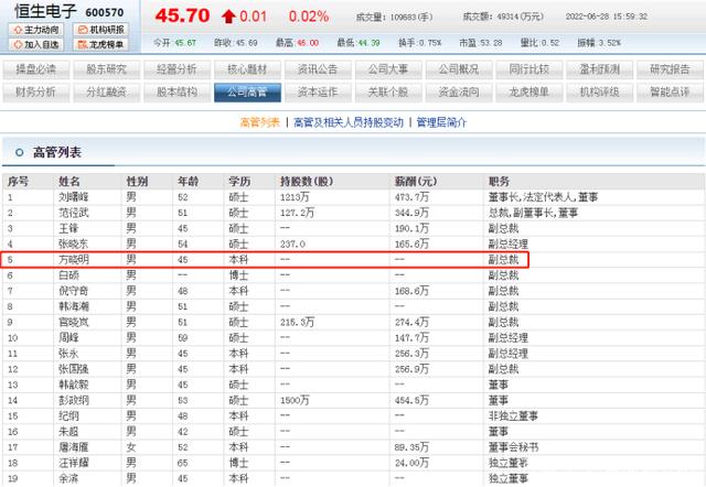 据有关资料显示,与方晓明同为副总裁的还有6人,他们当中年龄最大的为51岁的官晓岚和韩海潮。