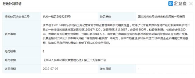 据杭税一稽罚2019235号显示,恒生电子为员工租赁房屋的发票被认定为虚开发票,违反了发票管理办法,但因当次检查进点时尚未过2018年度企业所得税汇算清缴期,该单位已自行纳税调整并缴纳了相应的企业所得税,所以并未给予罚款等处罚。