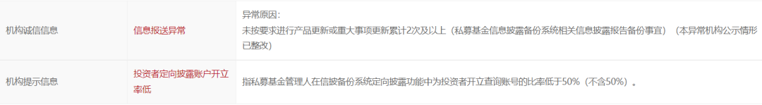 据中基协信息,杭州翌马有一条“信息报送异常”的诚信信息,目前已整改。还有一条“红字”提示,投资者定向披露账户开立率低于50%。