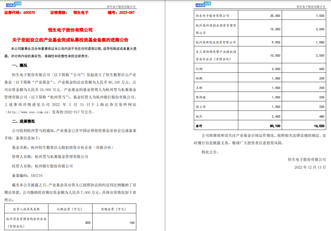 据公告披露,产业基金由杭州翌马私募基金管理有限公司(简称:杭州翌马)担任基金管理人,基金托管人为杭州银行股份有限公司(简称:杭州银行)。认缴出资总额为8.01亿元,恒生电子“牵头”认缴3.5亿元。其余出资方还有杭州高科技创业投资管理有限公司(简称:杭州高科创投)、长三角协同优势产业股权投资合伙企业(有限合伙)(简称:长三角协同优势)、杭州高新创业投资有限公司(简称:杭州高新创投)、杭州翌合管理咨询合伙企业(有限合伙)(简称:杭州翌合)及六名自然人。目前,各出资人均已按20%的相同比例缴纳了首期出资款;恒生电子实缴7000万元,占总额的比例约为43.7%。