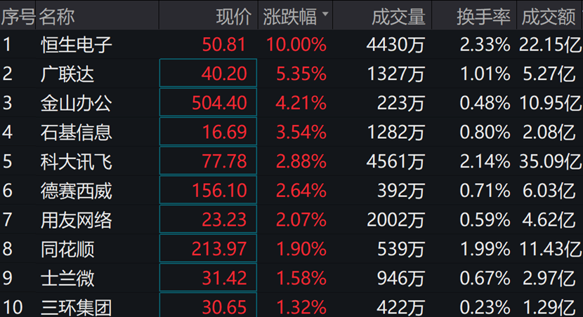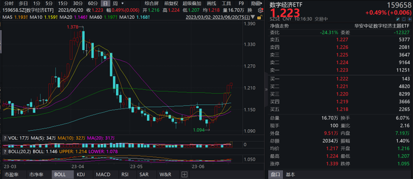 数字经济ETF(159658)紧密跟踪中证数字经济主题指数,指数成份股中,恒生电子上涨10%,广联达上涨5.35%,金山办公上涨4.21%,石基信息、科大讯飞等个股跟涨。