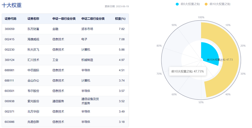 数据显示,截至2023年6月19日,该指数前十大权重股包括东方财富、海康威视、科大讯飞、汇川技术、中芯国际等,前十大之和为47.73%。(数据来源:中证指数公司,指数成份股不代表个股推荐)