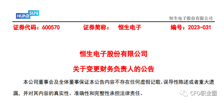 恒生电子股份有限公司(以下简称“公司”)董事会于近日收到公司财务负责人姚曼英女士的书面辞职报告,姚曼英女士因本人工作调整申请辞去公司财务负责人职务。辞职后,姚曼英女士继续在公司担任其他职务。根据《公司法》、《公司章程》以及相关法律法规的规定,姚曼英女士的辞职自辞职报告送达董事会之日起生效。