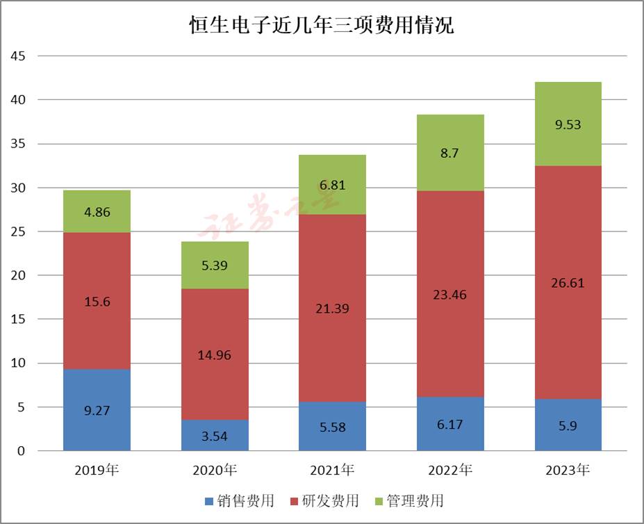2018年至2023年,恒生电子这三项费用增长迅速,分别为27.33亿、29.73亿、23.89、33.78亿、38.33亿及42.04亿。快速增长的费用,使得恒生电子的利润没能和营收同步增长。