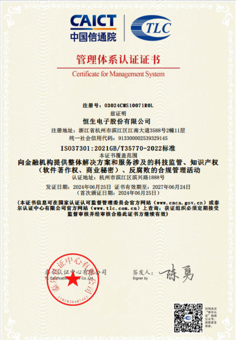 恒生电子股份有限公司是一家以“让金融变简单”为使命的金融科技公司,总部位于中国杭州。恒生电子高度重视公司的合规管理,组织公司合规人员积极参与由中国互联网协会与中国贸促会商法中心联合举办的企业合规师专业水平培训,截至本次认证审核前,已有9人通过了培训考核,获得了“企业合规师专业水平证书”。恒生电子的主要业务是向金融机构提供整体解决方案和服务,此次认证范围覆盖公司主要业务涉及的科技监管、软件著作权、商业秘密、反腐败的合规管理活动。ISO 37301是国际通用的合规管理体系认证标准,规定了组织建立、运行、保持和改进合规管理体系的要求。获得该认证,表明恒生电子具备该标准所要求的合规管理水平及能力。