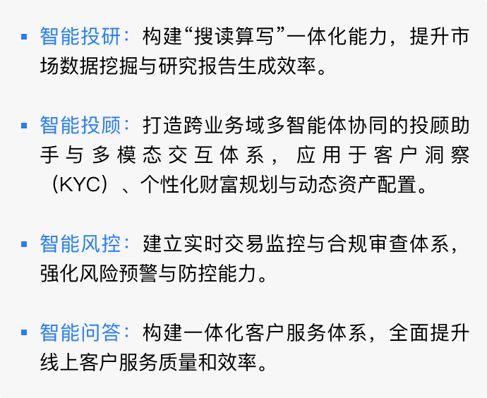 双方合作的核心目标是研发面向证券行业的高性能垂类大模型及智能体应用体系,以解决通用模型与智能体框架在金融场景下面临的专业性不足与合规性挑战。合作将重点聚焦以下四个核心业务领域的应用创新:
