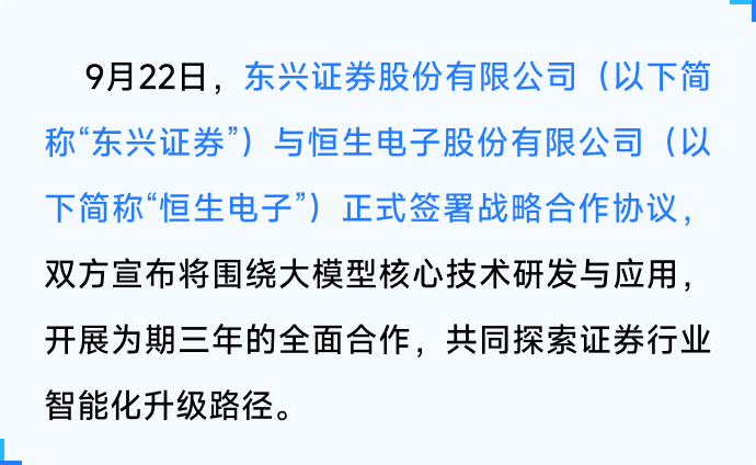 根据协议,双方将共同深化科技赋能,加快推进智能金融服务体系的构建。东兴证券表示将着力提升自身在大模型领域的自主研发能力,并积极引入恒生电子在金融垂类大模型技术研发与场景应用方面的经验,特别是其“光子系列”全栈式解决方案的相关成果。