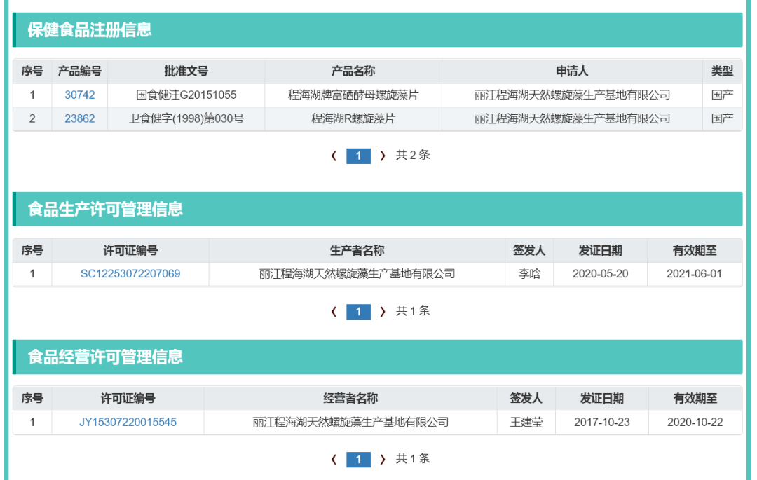 另需提及的是,与康恩贝合作的生产企业有的出现食品生产许可证过期情况。根据法人库特殊食品监管子库信息查询系统,丽江程海湖的食品生产许可证已于2021年6月1日过期。