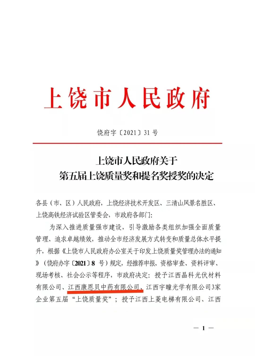 日前,上饶市人民政府发布《上饶市人民政府关于第五届上饶质量奖和提名奖授奖的决定》,康恩贝股份旗下的江西康恩贝中药有限公司荣获“上饶质量奖”殊荣。