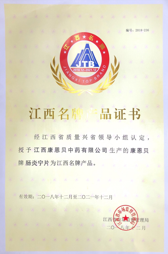 肠炎宁片拥有“肠炎宁片的检测方法”、“一种治疗胃肠炎中药制剂的制备方法”等多个发明专利,其中“肠炎宁片的检测方法”2017年度获得上饶市专利奖。“肠炎宁制剂在制备调节肠道菌群药物中的应用”和“一种无糖型肠炎宁片及其制备方法”两项国家发明专利已获国家知识产权局受理。