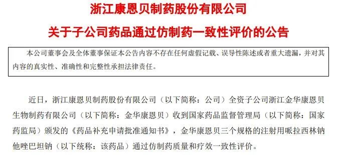 3月21日,康恩贝发布公告称,全资子公司浙江金华康恩贝生物制药的注射用哌拉西林钠他唑巴坦钠(三个规格)已获批通过仿制药质量和疗效一致性评价。据悉,该产品已纳入第八批国采,康恩贝“压线”拿下入场券。