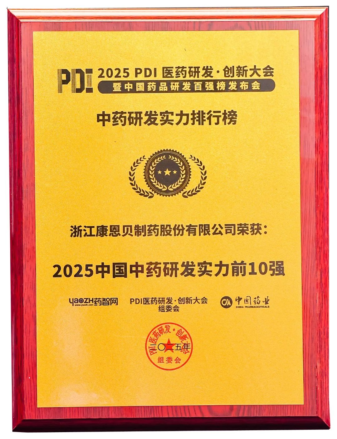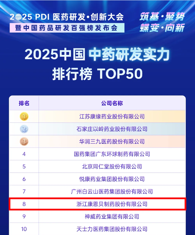 近日,“2025 PDI 医药研发·创新大会暨中国药品研发百强榜发布会”举办,会上重磅发布《2025中国中药研发实力排行榜》,康恩贝再次荣列“2025中国中药研发实力排行榜TOP50”第8位。