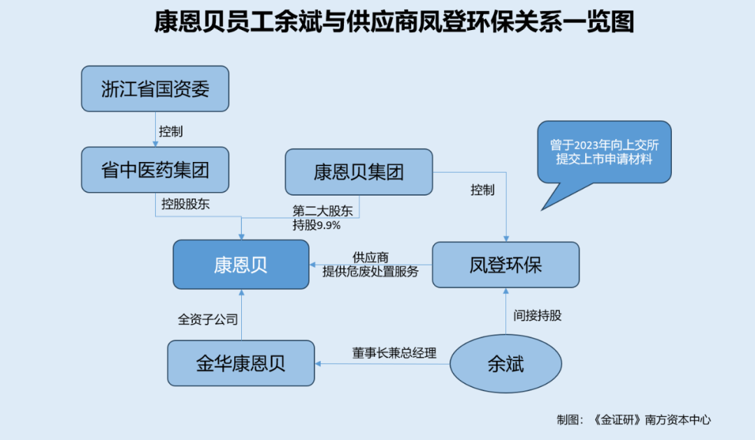 值得注意的是,凤登环保系关联方康恩贝集团控制的企业。2020-2024年,康恩贝向凤登环保及其子公司采购危废处置服务,累计金额超千万元。其中,2022年,凤登环保及其子公司系康恩贝采购危废处置业务的唯一供应商。法规显示,国有企业员工不得投资与本国有企业有业务关联的企业。而余斌作为子公司金华康恩贝董事长兼总经理,仍通过兰溪兰凤间接持有凤登环保。
