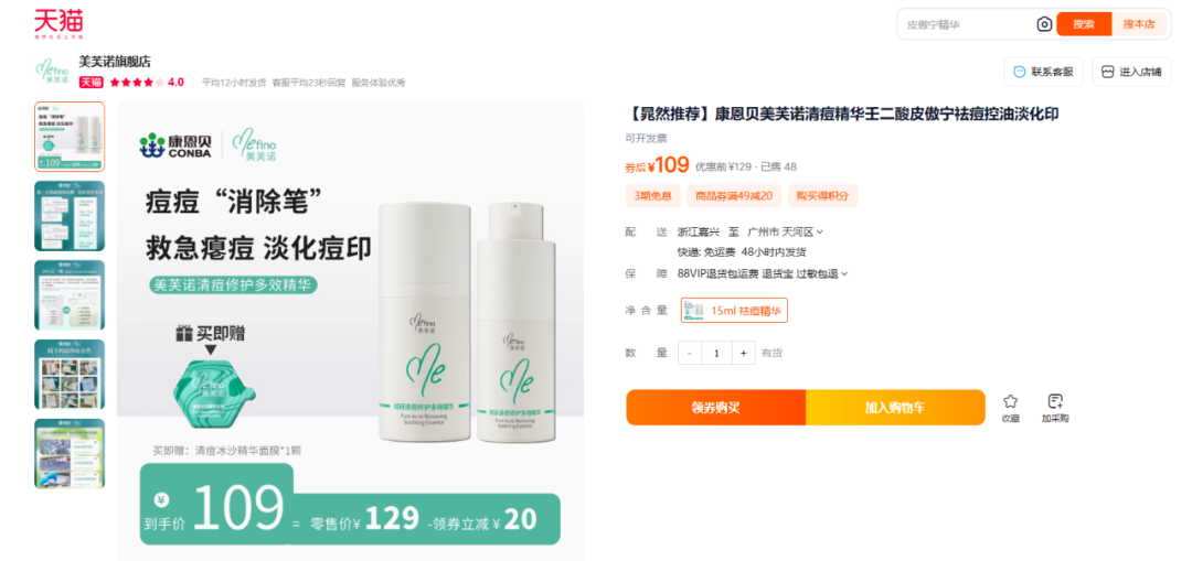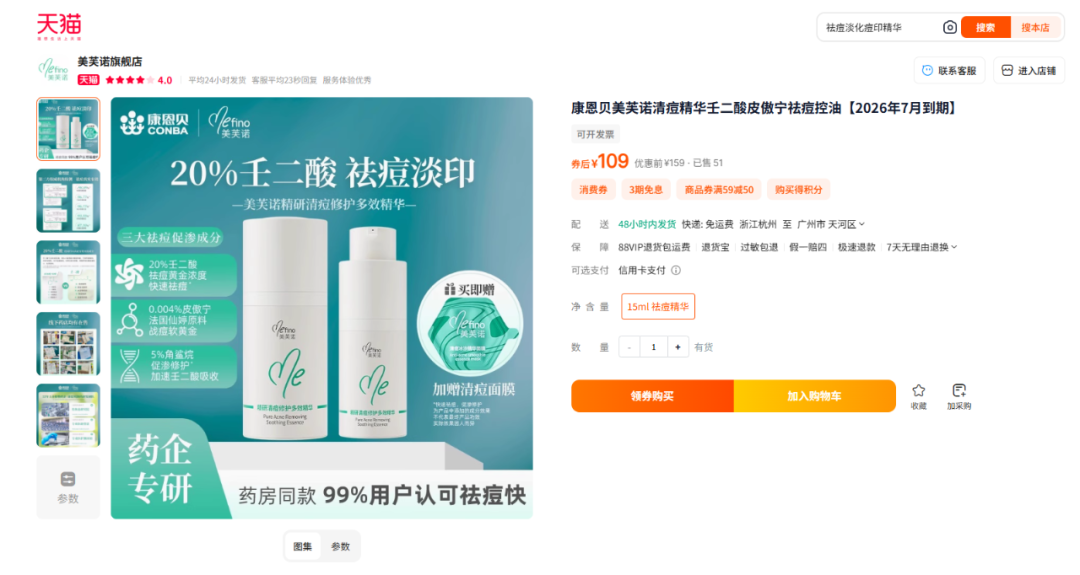此外,康恩贝子公司康恩贝销售公司经营的网店,销售康恩贝旗下化妆品“美芙诺精研清痘修护多效精华”,商品详情曾称该产品可以“淡化痘印”。而淡化痘印属于化妆品中的“祛斑美白”功效,具有“祛斑美白”功效的产品属于特殊化妆品,需要经国务院药品监督管理部门注册后方可生产。然而上述康恩贝的美芙诺清痘精华系普通化妆品,且其备案的功效并不包括“祛斑美白”。需要说明的是,截至2025年4月,康恩贝将上述“淡化痘印”的表述修改为“祛痘淡印”。