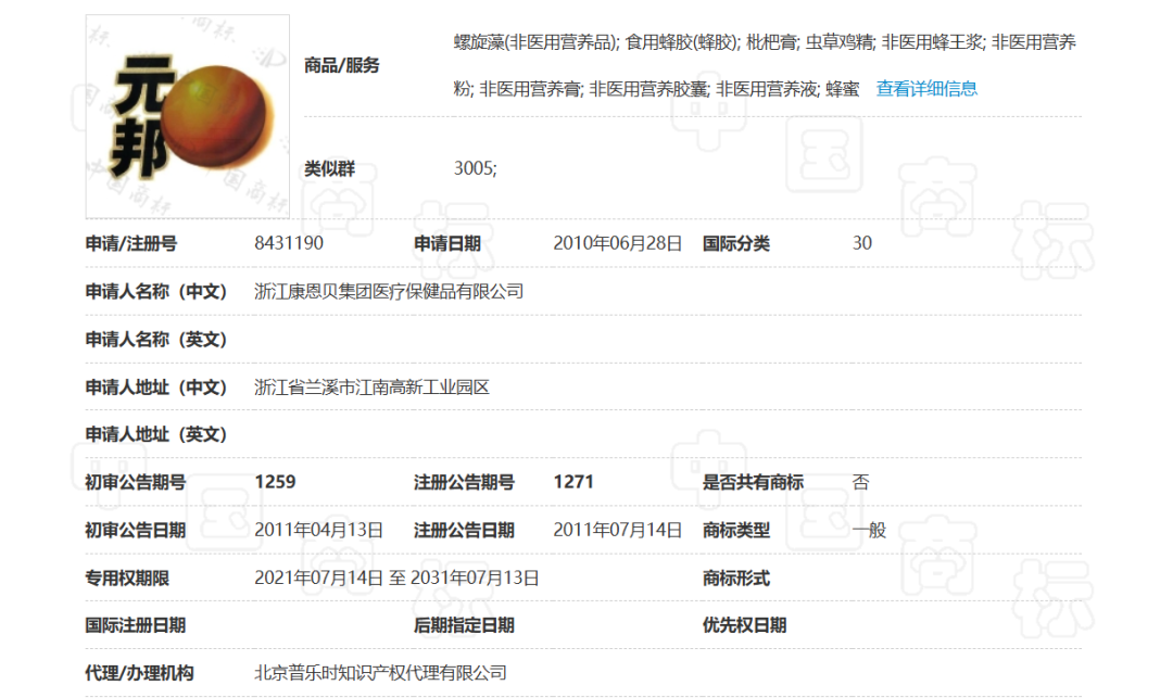 据国家知识产权局信息,申请号为8431190的“元邦”商标的申请人为浙保公司,申请日期为2010年6月28日,商品/服务包括非医用蜂王浆、非医用营养胶囊等。截至查询日2025年7月8日,该商标的状态为注册商标。