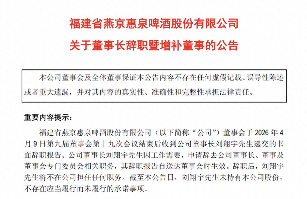 瑞财经刘治颖 4月12日,惠泉啤酒(SH600573)公告,公司董事长刘翔宇因工作需要,申请辞去公司董事长、董事及董事会专门委员会相关职务,辞职后,刘翔宇将不在公司担任任何职务。