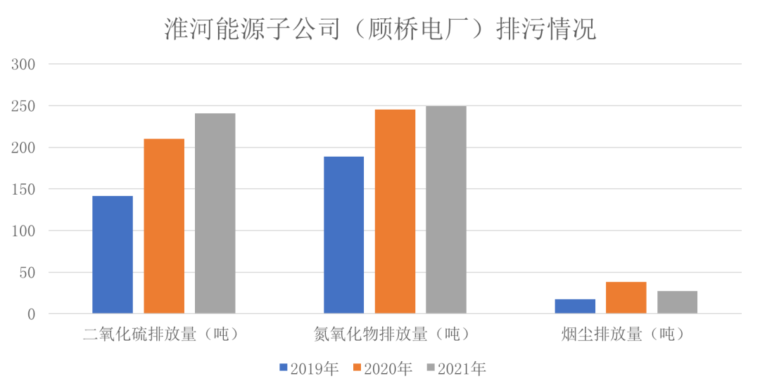 从排污情况来看,2019-2021年,淮河能源子公司(顾桥电厂)二氧化硫排放量分别为141.564吨、209.886吨、240.5吨;氮氧化物排放量分别为188.847吨、245.54吨、249.113吨;烟尘排放量分别为17.291吨、38.496吨、27.4吨。