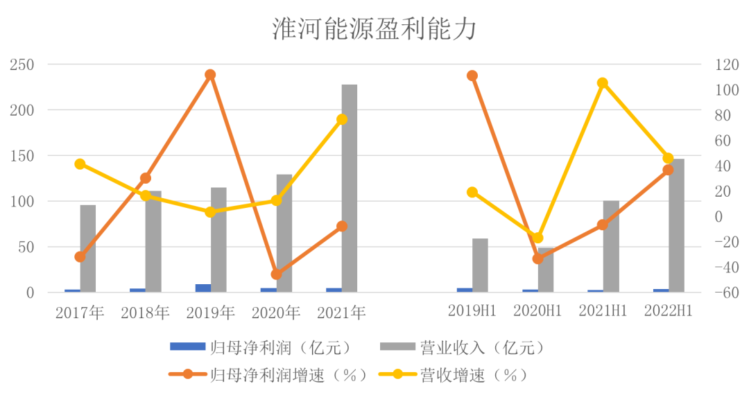 从半年报来看,2019年至2022年上半年,淮河能源的归母净利润分别为4.40亿元、2.93亿元、2.73亿元、3.74亿元,2022年上半年公司归母净利润较2021年同期相比有所上升。归母净利润增速分别为110.47%、-33.42%、-6.74%、36.68%,2022年上半年公司归母净利润增速较2021年同期相比有所上升,归母净利润增速由负转正。营业收入分别为58.93亿元、48.85亿元、100.30亿元、146.55亿元,2022年上半年公司营业收入较2021年同期相比有所上升。营收增速分别为19.31%、-17.11%、105.31%、46.12%,2022年上半年公司营收增速较2021年同期相比有所下降。