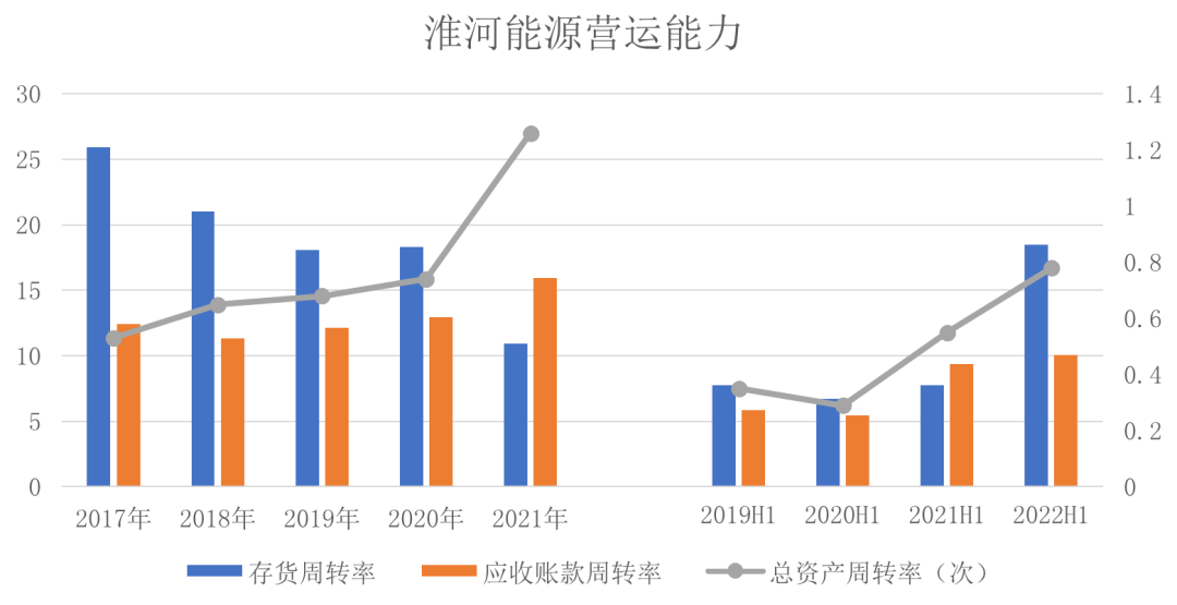 从半年报来看,2019年至2022年上半年,淮河能源的存货周转率分别为7.74、6.71、7.75、18.45,2022年上半年公司存货周转率较2021年同期相比有所上升。应收账款周转率分别为5.82、5.45、9.37、10.06,2022年上半年公司应收账款周转率较2021年同期相比有所上升。总资产周转率分别为0.35、0.29、0.55、0.78,2022年上半年公司总资产周转率较2021年同期相比有所上升。