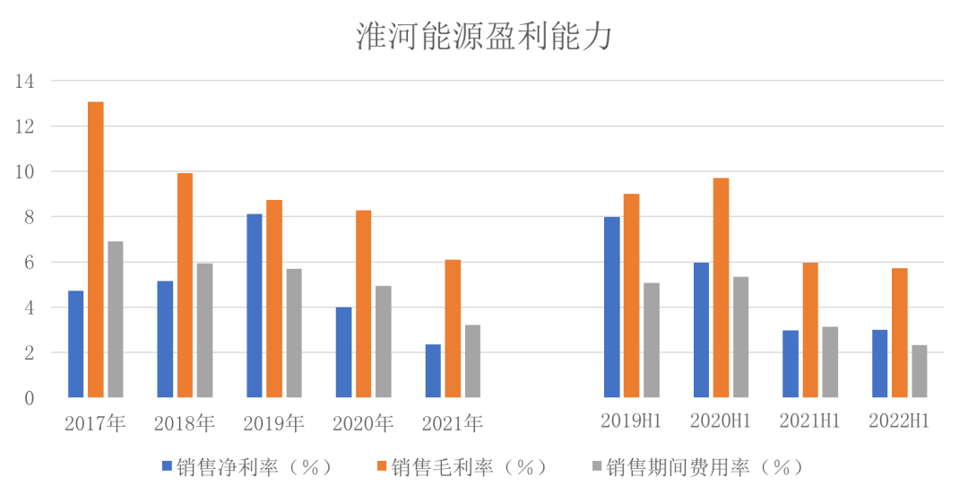 从半年报来看,2019年至2022年上半年,淮河能源的销售净利率分别为7.99%、5.95%、2.98%、3.00%,2022年上半年公司销售净利率较2021年同期相比有所上升。销售毛利率分别为9.00%、9.70%、5.96%、5.73%,2022年上半年公司销售毛利率较2021年同期相比有所下降。销售期间费用率分别为5.08%、5.35%、3.14%、2.34%,2022年上半年公司销售期间费用率较2021年同期相比有所下降。