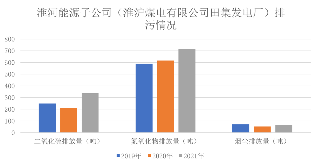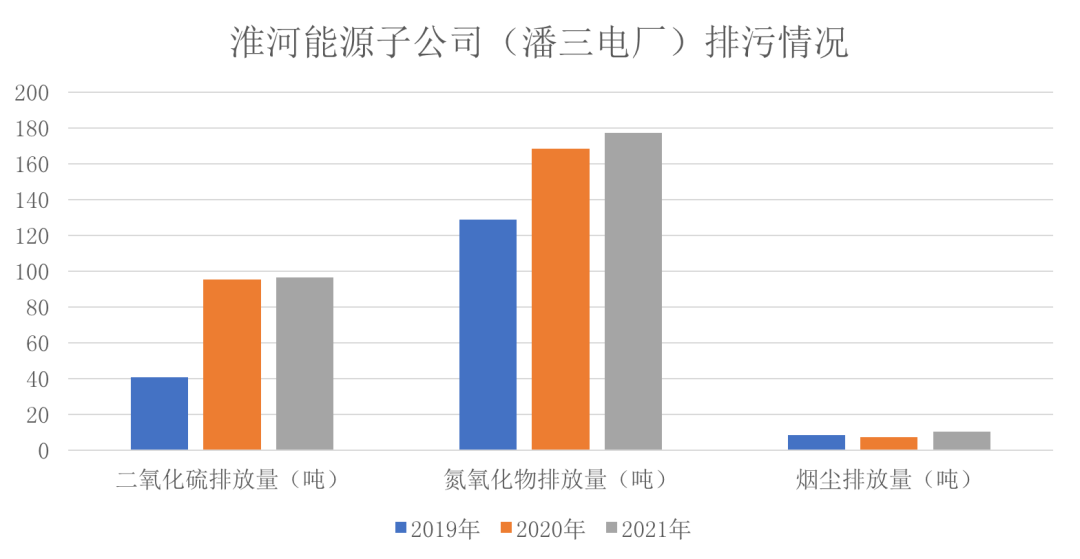 从排污情况来看,2019-2021年,淮河能源子公司(潘三电厂)二氧化硫排放量分别为40.8吨、95.41吨、96.69吨;氮氧化物排放量分别为129.16吨、168.61吨、177.37吨;烟尘排放量分别为8.76吨、7.56吨、10.38吨。