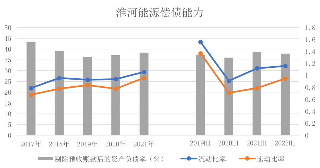 从半年报来看,2019年至2022年上半年,淮河能源的流动比率分别为1.56、0.91、1.12、1.16,2022年上半年公司流动比率较2021年同期相比有所上升。速动比率分别为1.37、0.71、0.79、0.95,2022年上半年公司速动比率较2021年同期相比有所上升。剔除预收账款后的资产负债率分别为37.15%、36.09%、38.72%、37.88%,2022年上半年公司剔除预收账款后的资产负债率较2021年同期相比有所下降。