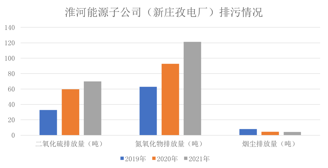 从排污情况来看,2019-2021年,淮河能源子公司(新庄孜电厂)二氧化硫排放量分别为32.67吨、59.67吨、69.75吨;氮氧化物排放量分别为62.87吨、92.71吨、121.25吨;烟尘排放量分别为7.89吨、4.486吨、4.268吨。