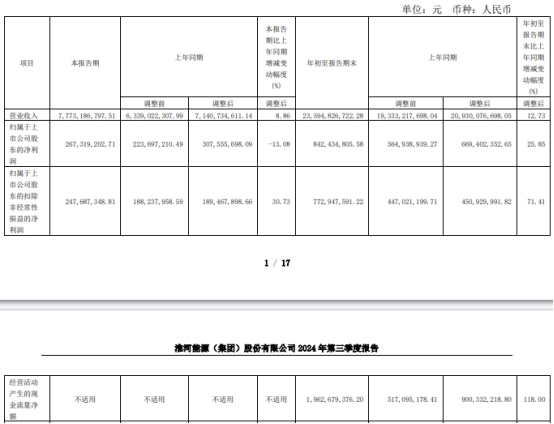2024年前三季度,淮河能源营业收入为235.95亿元,同比增长12.73%;归属于上市公司股东的净利润8.42亿元,同比增长25.85%;归属于上市公司股东的扣除非经常性损益的净利润7.73亿元,同比增长71.41%;经营活动产生的现金流量净额19.63亿元,同比增长118.00%。